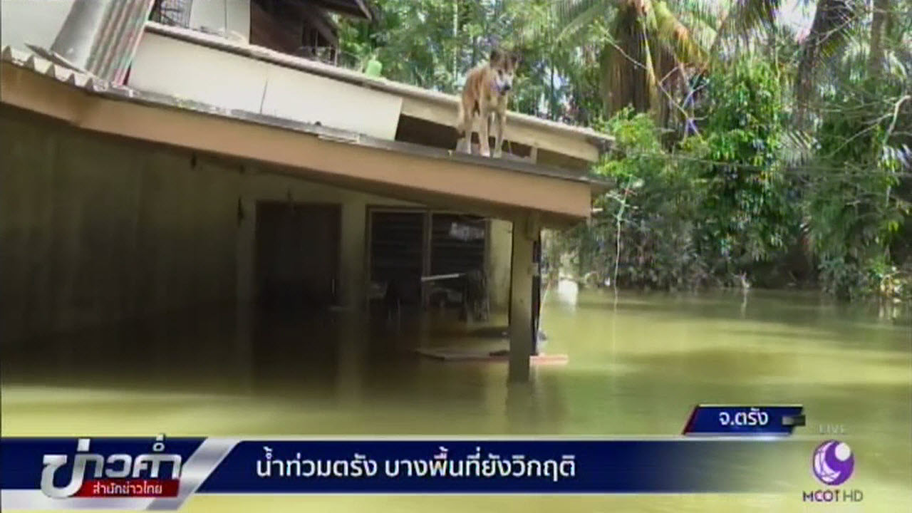 ส่วนสถานการณ์น้ำท่วมใน จ.ตรัง หลายพื้นที่ เริ่มคลี่คลาย ชาวบ้านเร่งลงมือทำความสะอาดบ้านเรือน แต่ชาวบ้านที่อยู่ติดพนังกั้นแม่น้ำตรัง ซึ่งทรุดตัวเป็นทางยาวกว่า 100 เมตร ยังต้องระทม เนื่องจากขณะนี้มีน้ำท่วมสูง 20-60 เซนติเมตร ต้องใช้เรือในการสัญจรเข้าออกพื้นที่