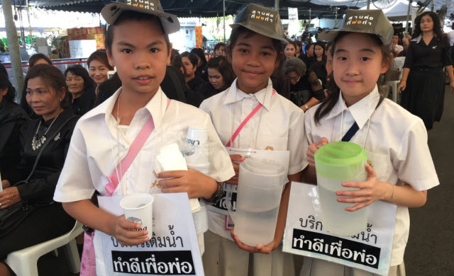 ขณะที่ ยังคงมีจิตอาสามาช่วยอำนวยความสะดวก แจกน้ำ-อาหาร และปฐมพยาบาลเช่นเคย โดยวันนี้นักเรียนชั้นประถมศึกษาปีที่ 4 โรงเรียนรุ่งอรุณ อาสามาแยกขยะ และบริการเติมน้ำดื่มให้กับประชาชน ที่มานั่งรออยู่บริเวณเต้นท์พักคอย เด็กๆ เล่าว่า มีโอกาสได้เข้าไปกราบถวายบังคมพระบรมศพพระบาทสมเด็จพระปรมินทรมหาภูมิพลอดุลยเดชแล้วหลายครั้ง รู้สึกมีความสุขที่ได้เข้าไปกราบ และตั้งใจว่า ถ้ามีโอกาสจะเข้าไปกราบถวายบังคมพระบรมศพอีก ส่วนการทำหน้าที่จิตอาสา เป็นความภาคภูมิใจที่ได้มีโอกาสทำหน้าที่นี้ เพราะเป็นการทำความดีถวาย