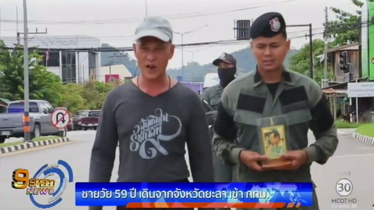 ยะลา 16 พ.ย.-ชายวัย 59 ปี เดินเท้าจากเบตง จ.ยะลา เมื่อ 3 วันก่อน เพื่อไปกราบถวายบังคมพระบรมศพ ล่าสุด เดินทางมุ่งหน้าเข้า อ.เมืองยะลา แล้ว