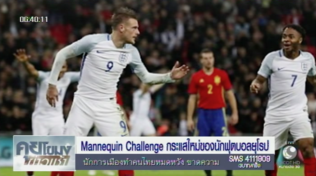 เจมี วาร์ดี กองหน้าทีมชาติอังกฤษ แสดงท่าดีใจตามกระแสนิยมที่เรียกว่า Mannequin Challenge หลังโหม่งประตูให้อังกฤษ นำสเปน 2-0 ในเกมอุ่นเครื่องเมื่อคืนที่ผ่านมา โดยวิธีการเล่น คือ ผู้แสดงต้องทำกิจกรรมใดๆ ก็ตามที่เหมือนกับกำลังเคลื่อนไหว แต่เมื่อกล้องจับไป พวกเขาต้องหยุดนิ่งไว้ ห้ามขยับ เหมือนกับหุ่นขี้ผึ้งตามพิพิธภัณฑ์