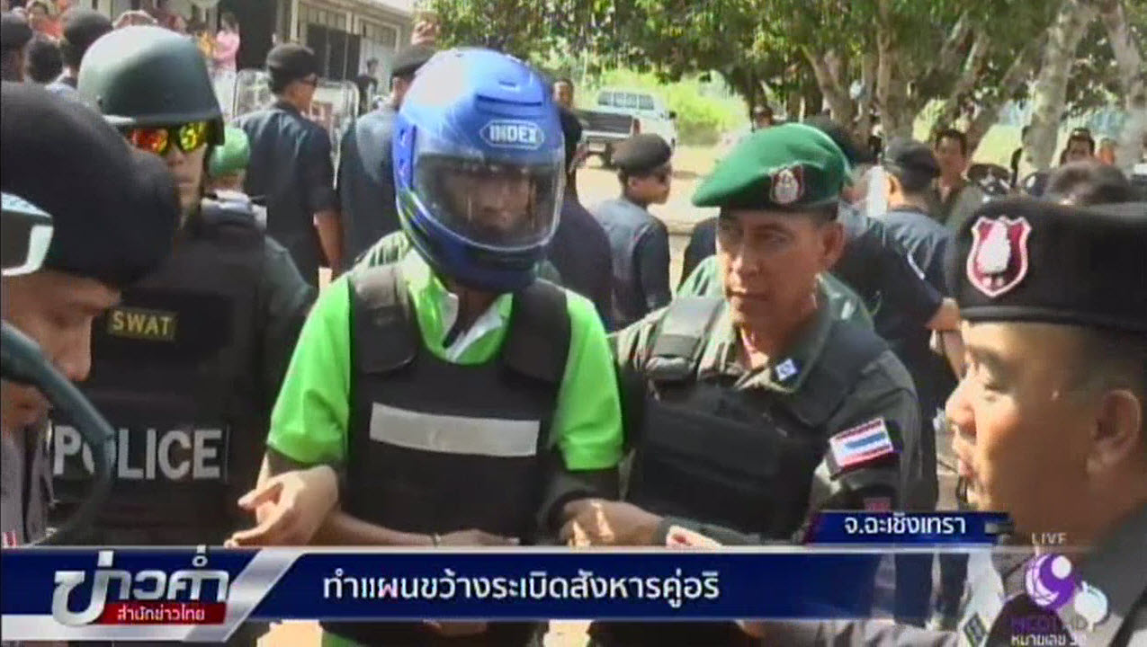 ฉะเชิงเทรา 30 ม.ค.-ญาติผู้เสียชีวิตพยายามฝ่าวงล้อมตำรวจชุดควบคุมฝูงชนเข้าไปรุมประชาทัณฑ์ 2 พี่น้องผู้ต้องหาปาระเบิดใส่คู่อริ กลางงานวัดใน จ.ฉะเชิงเทรา ทำให้มีผู้เสียชีวิต 4 คน บาดเจ็บ 5 คน ขณะตำรวจควบคุมตัวไปทำแผนประกอบคำรับสารภาพ