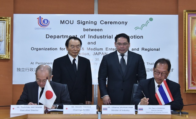 กรุงเทพฯ 30 ม.ค. – นายอุตตม สาวนายน รัฐมนตรีว่าการกระทรวงอุตสาหกรรม ประธานในพิธีลงนามบันทึกความเข้าใจเพื่อสร้างเครือข่ายในการพัฒนาภาคอุตสาหกรรมไทยกับญี่ปุ่นระหว่างกรมส่งเสริมอุตสาหกรรม (กสอ.) และองค์การเพื่อวิสาหกิจขนาดกลางและขนาดย่อมและนวัตกรรมภูมิภาคแห่งประเทศญี่ปุ่น หรือ SMRJ เพื่อนำองค์ความรู้ในการพัฒนาเอสเอ็มอีของญี่ปุ่นในการพัฒนาเอสเอ็มอีไทย