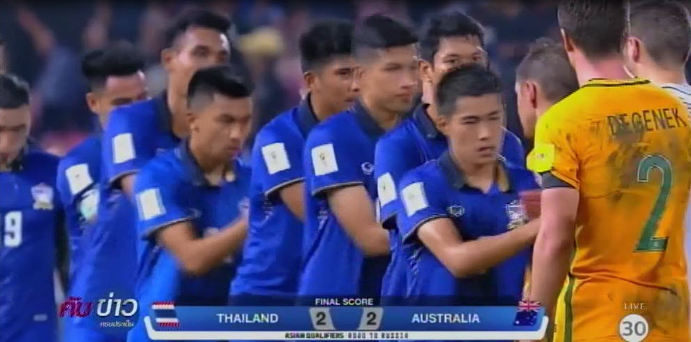 กทม. 15พ.ย.- ทีมชาติไทยเสมอกับออสเตรเลียแบบน่าชนะ 2-2 ในการแข่งขันฟุตบอลโลก 2018 รอบคัดเลือก โซนเอเชีย เก็บแต้มแรกในรอบ 12 ทีมสุดท้าย