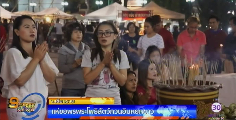 ชาวเชียงราย ชาวไทยเชื้อสายจีน และนักท่องเที่ยว ต่างเข้ากราบไหว้สักการะพระโพธิสัตว์กวนอิมหยกขาว ที่เทศบาลนครเชียงราย ได้อัญเชิญมาจากวัดห้วยปลากั้ง นำมาประดิษฐานภายในสวนตุง และโคมเฉลิมพระเกียรติฯ อย่างเนืองแน่น เพื่อความเป็นสิริมงคลรับเทศกาลตรุษจีน ประจำปี 2560 มีพระอาจารย์พบโชค ติสะวังโส เจ้าอาวาสวัดห้วยปลากั้ง กล่าวสัมโมนียกถา และอำนวยพรและประกอบพิธีแก้ปีชง รวมทั้งปลุกเสกส้มให้กับผู้ที่มาร่วมงานเพื่อความเป็นศิริมงคลด้วย อีกทั้งยังมีการเชิดสิงโต และมังกรทองนำโชคของเยาวชนชาวเชียงราย โดยจะเปิดให้ประชาชนสักการะไปจนถึงวันพรุ่งนี้ (29 ม.ค.) เวลา 09.29 น. ก่อนจะอัญเชิญกลับไปประดิษฐานยังวัดห้วยปลากั้งดังเดิม.-สำนักข่าวไทย