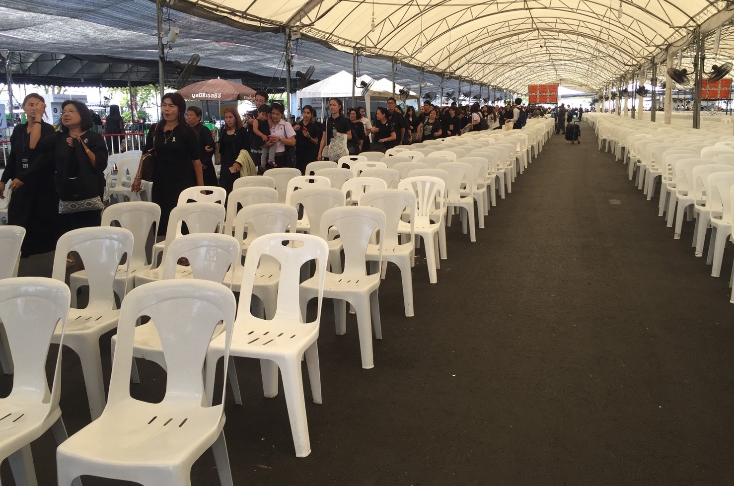 บรรยากาศการกราบถวายบังคมพระบรมศพพระบาทสมเด็จพระปรมินทรมหาภูมิพลอดุลยเดชด้านในพระบรมมหาราชวัง ตลอดทั้งวันเป็นไปด้วยความเรียบร้อย ประชาชนยังคงทยอยเดินทางมาต่อคิวด้านในเต๊นท์โซนเหนืออย่างต่อเนื่อง และเนื่องจากวันนี้มีจำนวนประชาชนมารอเข้าคิวไม่มากนัก ทำให้เต้นท์โซนเหนือว่างกว่า 7 เต้นท์จากทั้งหมด 8 เต้นท์ ซึ่งประชาชนที่ผ่านจุดตรวจคัดกรองตามจุดต่างๆ และเข้ามาด้านในสนามหลวงแล้วสามารถเดินเข้ามาต่อคิวได้ยังบริเวณเต้นท์โซนเหนือ ก.ไก่ ได้เลยโดยไม่ต้องไปต่อที่จุดท้ายคิว ซึ่งจะใช้เวลาในการรอไม่เกิน 2 ชั่วโมง เจ้าหน้าที่ก็จะทยอยนำมาที่จุดรอคอย เพื่อรอเดินเข้าไปด้านในพระบรมมหาราชวังและเข้ากราบถวายบังคมพระบรมศพ