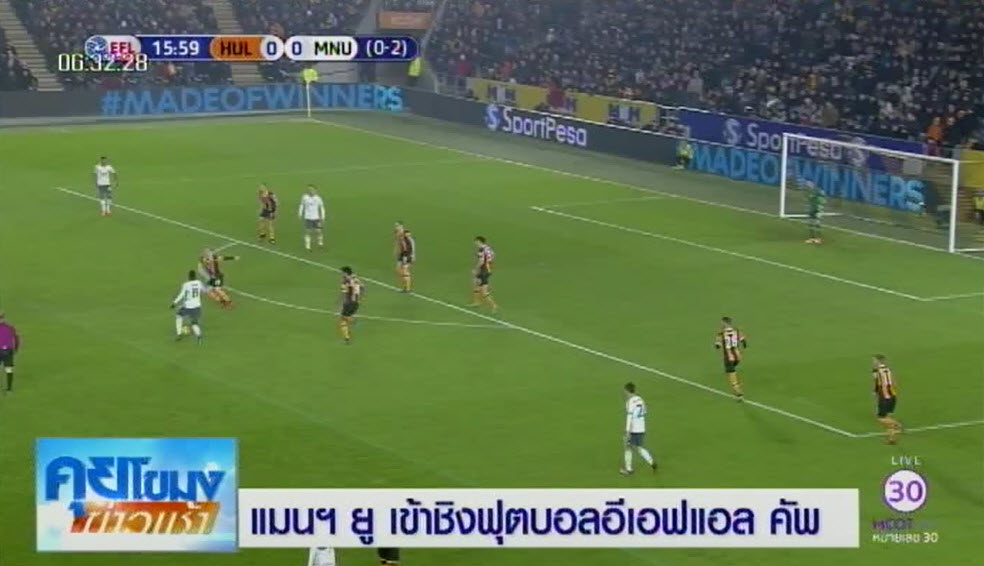 ฟุตบอลอีเอฟแอล คัพ หรือลีก คัพ ของอังกฤษ รอบรองชนะเลิศ นัดที่ 2 “เดอะ ไทเกอร์ส” ฮัลล์ ซิตี้ เปิดเคคอม สเตเดี้ยม พบกับ “ปีศาจแดง” แมนเชสเตอร์ ยูไนเต็ด ซึ่งช่อง 9 MCOT HD หมายเลข 30 ถ่ายทอดสดเมื่อคืนที่ผ่านมา โดยเกมแรกแมนฯยูฯ ชนะมาก่อน 2-0 กุมความได้เปรียบไว้ก่อน