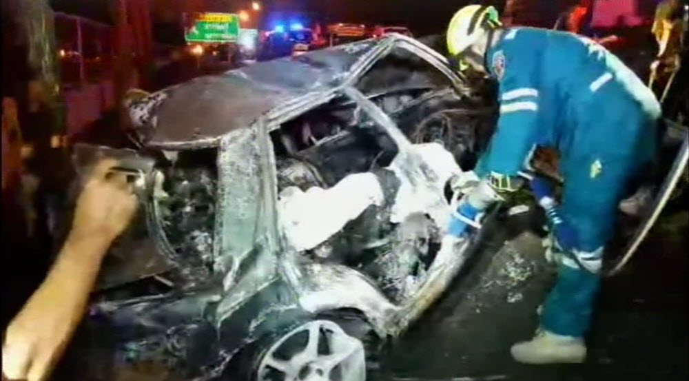 รถเก๋งเสียหลักชนต้นไม้ และเกิดเพลิงลุกไหม้บริเวณถนนมอเตอร์เวย์ มุ่งหน้าลำลูกกา ตรงข้ามคลังน้ำมัน ปตท. หมู่ 6 ต.ลาดสวาย อ.ลำลูกกา จ.ปทุมธานี ทำให้นายวรพจน์ พัฒน์ราม อายุ 35 ปี คนขับ ถูกไฟไหม้ดำเป็นตอตะโก เสียชีวิตอยู่ภายในรถ ส่วนสาเหตุคาดว่าหลับใน เนื่องจากตรวจสอบไม่พบร่องรอยการเบรก. – สำนักข่าวไทย