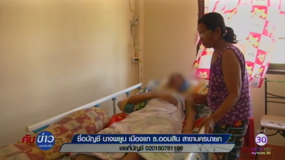 นครนายก 26 ม.ค.- วอนช่วยแม่วัย 60 ต้องดูแลลูกชายวัย 35 สมองพิการ ขยับตัวไม่ได้ หลังประสบอุบัติเหตุเมื่อ 3 ปีก่อน มีรายได้แค่เบี้ยผู้สูงอายุ และเบี้ยคนพิการ