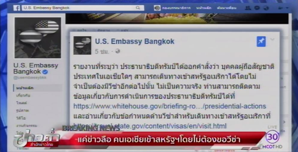 กรุงเทพฯ 26 ม.ค.-ในโลกออนไลน์มีข่าวลือว่า ประธานาธิบดีโดนัลด์ ทรัมป์ ของสหรัฐ ลงนามอนุญาตให้คนเอเชียเข้าสหรัฐได้โดยไม่ต้องขอวีซ่านั้น ล่าสุด สถานเอกอัครราชทูตสหรัฐอเมริกาประจำประเทศไทย ยืนยันแล้วว่า ข่าวลือดังกล่าวไม่เป็นความจริง.-สำนักข่าวไทย