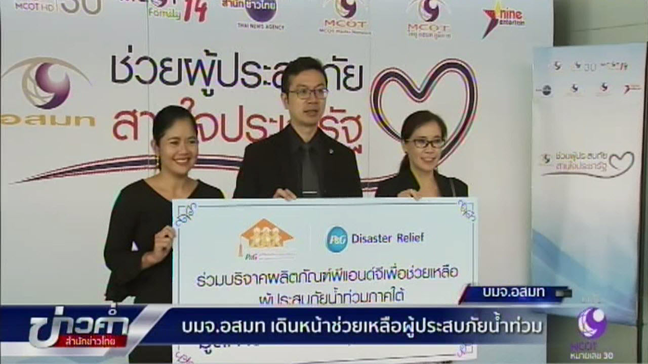 ธารน้ำใจคนไทยยังคงหลั่งไหลส่งต่อให้ความช่วยเหลือผู้ประสบภัยน้ำท่วมภาคใต้ไม่ขาดสาย นายพิเศษ จียาศักดิ์ รักษาการในตำแหน่งกรรมการผู้อำนวยการใหญ่ บมจ.อสมท รับมอบเงินบริจาคและสิ่งของอุปโภคบริโภคจากหลายหน่วยงาน ทั้งบริษัทกลางคุ้มครองผู้ประสบภัยจากรถ จำกัด มอบน้ำดื่มช่วยเหลือผู้ประสบอุทกภัยจำนวน 12,000 ขวด บริษัท เจ.เจ.มอลล์ จำกัด ร่วมบริจาคสิ่งของอุปโภคบริโภค และเงินจำนวน 50,000 บาท บริษัท พีแอนด์จี ร่วมบริจาคผลิตภัณฑ์ในเครือ มูลค่ารวม 130,000 บาท ขณะที่บริษัทไทยเบฟเวอเรจ จำกัด มหาชน มอบน้ำดื่ม มูลค่า 50,000 บาท เพื่อช่วยเหลือผู้ประสบภัย