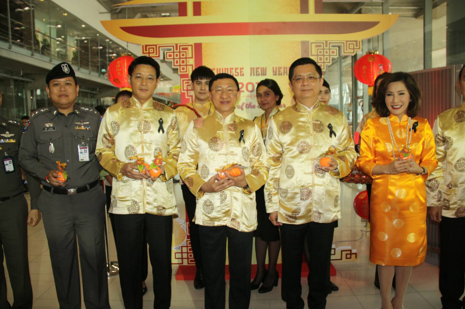 สมุทรปราการ 26 ม.ค.- ท่าอากาศยานสุวรรณภูมินำเจ้าหน้าที่แต่งกายชุดจีนสร้างความประทับใจให้นักท่องเที่ยวเทศกาลตรุษจีน มอบของที่ระลึกสบู่ผลส้มและชมแสดงรำพัดจีน