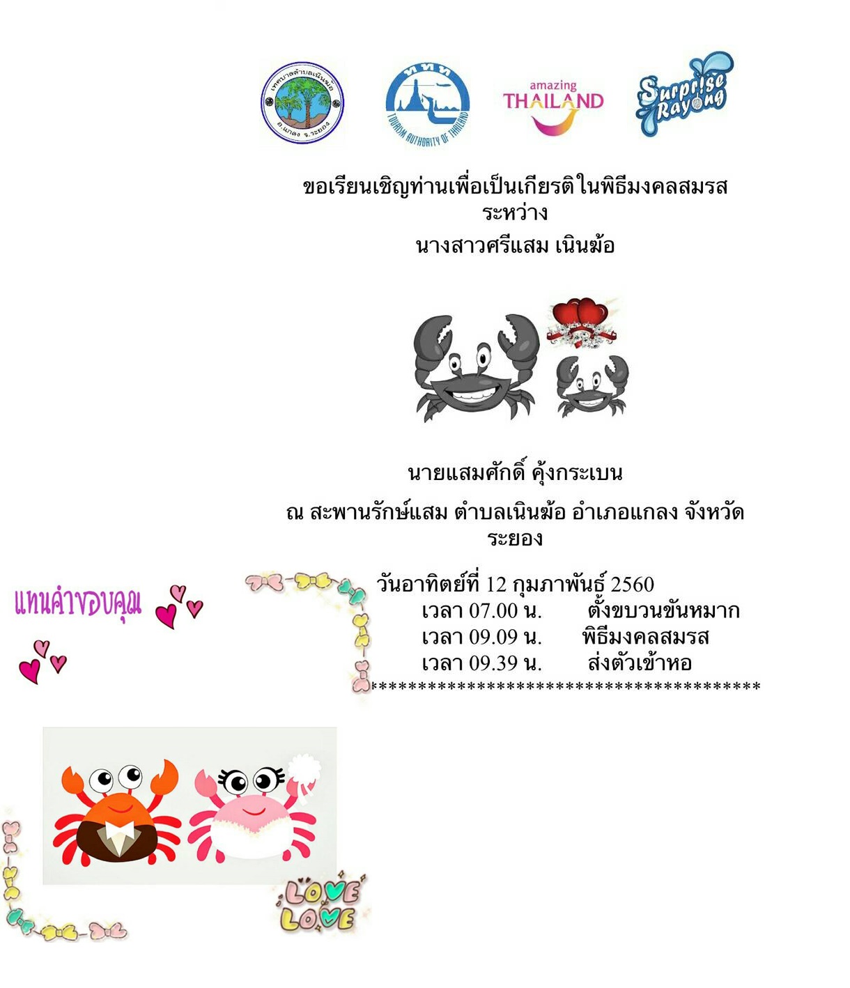 ระยอง 25 ม.ค.- วาเลนไทน์ระยองปีนี้จัดพิเศษ ททท.และเทศบาลเนินฆ้อชวนนักท่องเที่ยวฉลองงานแต่ง “ปูแสมปูดำ” อนุรักษ์ทรัพยากรสัตว์น้ำ 12 ก.พ.นี้ มีพิธีแห่ขันหมากปูเจ้าบ่าวจากจันทบุรีสู่ขอปูเจ้าสาวระยอง