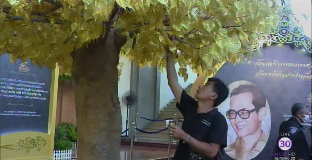 ที่หอประชุมใหญ่ มหาวิทยาลัยธรรมศาสตร์ บรรยากาศงาน “๙ ตามพ่อสานต่อพระราชปณิธาน” ซึ่ง บมจ.อสมท ร่วมกับองค์กรพันธมิตร จัดขึ้นเพื่อน้อมสำนึกในพระมหากรุณาธิคุณ พระบาทสมเด็จพระปรมินทรมหาภูมิพลอดุลยเดช มีประชาชนเดินทางมาชมนิทรรศการอย่างต่อเนื่อง พร้อมเขียนปณิธานทำความดีบนใบโพธิ์ทองเหลือง 1 ใบต่อ 1 ครอบครัว เพื่อนำไปแขวนที่ต้นโพธิ์พระบารมี ซึ่งใบโพธิ์ทั้งหมดจะนำมาหลอม และหล่อเป็นพระพุทธรูปมอบให้โรงเรียนทั่วประเทศ นอกจากนี้ ประชาชนยังให้ความสนใจชมวีดิทัศน์สารคดีพระราชกรณียกิจ พระบาทสมเด็จพระปรมินทรมหาภูมิพลอดุลยเดช