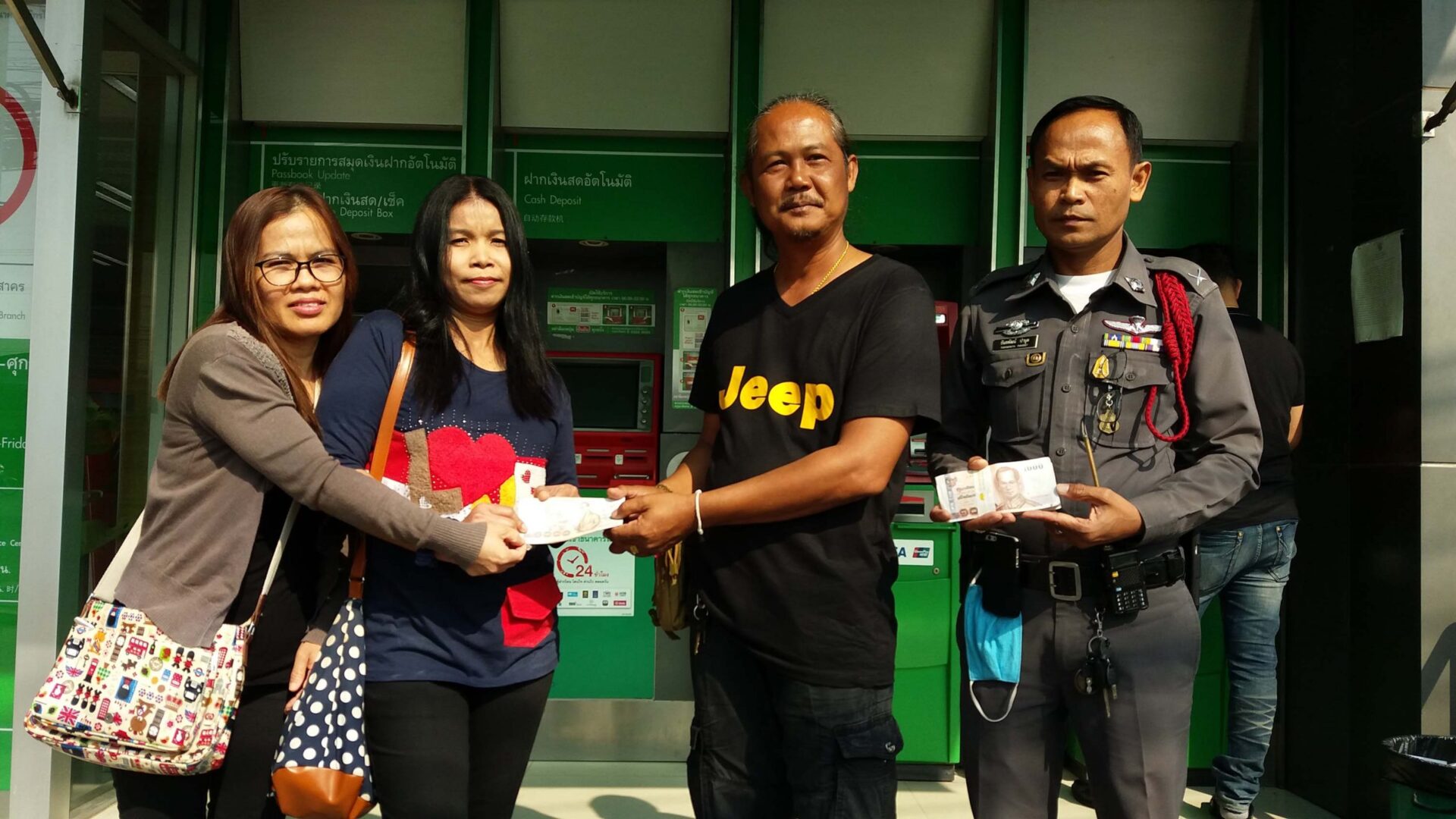 วันนี้ (23 ม.ค.) ที่หน้าธนาคารกสิกรไทย สาขาถนนเอกชัย อำเภอเมือง จังหวัดสมุทรสาคร นายกุศล ไฝกิ่ง อายุ 53 ปี ชาว จ.นครราชสีมา รับเงินคืนจากพลเมืองดี คือ น.ส.รัตนา ศรีตะวัน อายุ 44 ปี และนางจงกร ทับมะโรง อายุ 49 ปี พนักงานโรงงาน โดยมี ด.ต.ดร.ธันยพัฒน์ ปานูต ผบ.หมู่งานป้องกันและปราบปราม สภ.โคกขาม เป็นสักขีพยาน หลังจากได้สืบหาตัวเจ้าของเงินสดและติดต่อให้มารับคืนในวันนี้จำนวน 70,000 บาท ซึ่ง น.ส.รัตนา และนางจงกร พบเงินสดดังกล่าวตกอยู่ทางขึ้นจะไปกดเงินตู้เอทีเอ็มเมื่อวานนี้ (22 ม.ค.)