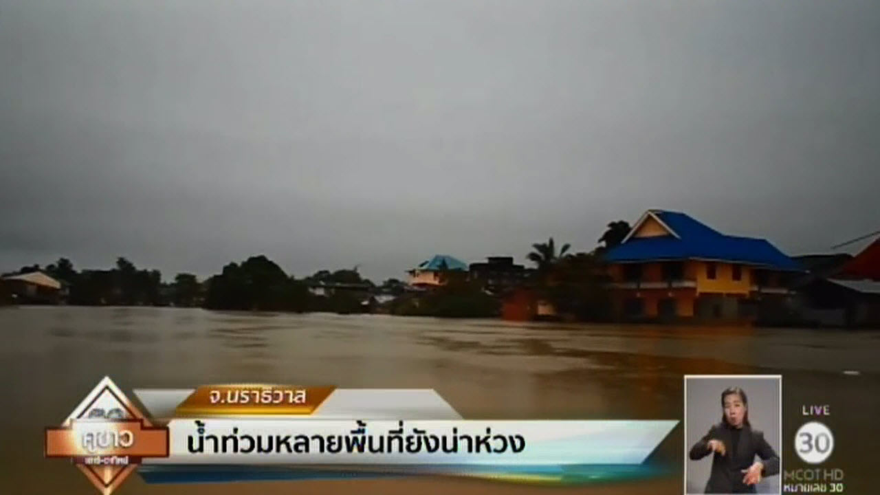 ที่จังหวัดนราธิวาส ยังคงมีฝนตกครอบคลุมพื้นที่ทั้ง 13 อำเภอ ส่งผลให้แม่น้ำสายหลัก 3 สาย คือ แม่น้ำสุไหงโกลก บางนราและสายบุรี ล้นตลิ่ง และไหลบ่าเข้าท่วมบ้านเรือนพื้นที่ทางเกษตรเกษตรของประชาชนรวมถึงโรงเรียนต่างๆ และมีแนวโน้มน้ำท่วมสูงขึ้นอย่างต่อเนื่องพื้นที่ 2 ฝั่งริมน้ำด้านอำเภอสุไหงโกลก ระดับน้ำสูง 1-1.50 เมตร โดยเฉพาะในพื้นที่ 9 ชุมชน เขตเทศบาลเมืองสุไหงโกลก ถูกน้ำท่วมซ้ำซากเป็นระลอกที่ 3 บางครอบครัวต้องอพยพไปอยู่ที่อื่นชั่วคราว เนื่องจากน้ำท่วมสูงมิดตัวบ้านชั้นล่าง นอกจากนี้น้ำที่ไหลเชี่ยวยังกัดเซาะถนนยางมะตอยทางเข้าบ้านค่าย หมู่ 2 ตำบลกะลุวอเหนือ อำเภอเมืองนราธิวาส จนขาดเป็นทางยาวกว่า 5 เมตร รถทุกชนิดผ่านไม่ได้ อบต.กะลุวอเหนือยังไม่สามารถเข้าซ่อมแซมได้ เนื่องจากต้องรอน้ำลดลงกว่านี้