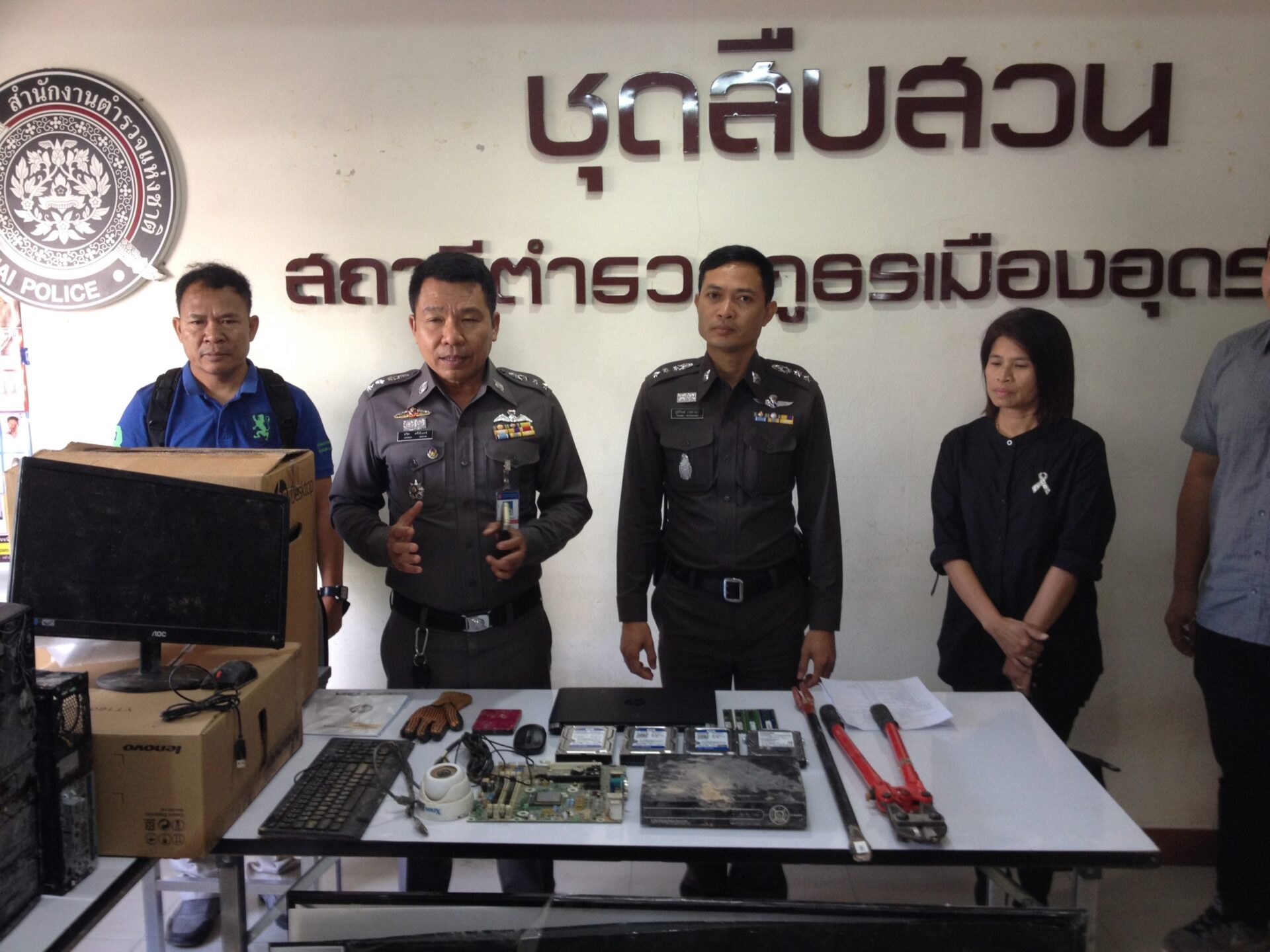 พ.ต.อ.ชวิศ ศรีจันทร์ รอง ผบก.ภ.จ.อุดรธานี พ.ต.อ.ภูมิวิทย์ เวชกามา ผกก.สภ.เมืองอุดรธานี และชุดสืบสวน แถลงจับกุมนายวิศรุต อินศิริ อายุ 26 ปี ในข้อกล่าวหาลักทรัพย์คอมพิวเตอร์ 60 ชุดของนายจ้าง พร้อมของกลางโน้ตบุ๊ก ฮาร์ดดิสก์ แรม เครื่องบันทึกกล้องวงจรปิด , คอมพิวเตอร์ , จอคอมพิวเตอร์ เมนบอร์ด ฮาร์ดดิสก์แบบพกพา กล้องวงจรปิด 1 ตัว ทีวีจอแบน บางส่วนที่ค้นพบในบ้านพัก และนำไปทิ้งในบ่อน้ำทำลายหลักฐาน และอุปกรณ์และรถใช้ในการก่อเหตุ คีมตัดเหล็ก , ชะแลง , รถกระบะนิสสัน นาวาร่า สีขาว ทะเบียน ผข 7515 อุดรธานี โดยเจ้าของกิจการเดินทางมายืนยันของกลาง และรู้สึกเสียใจที่ลูกน้องทำงานด้วยกันมา 5 ปี มาขโมยสินค้าไปขายเสียหายกว่า 600,000 บาท