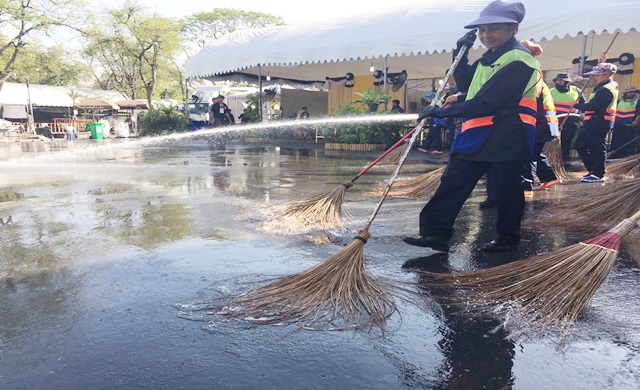ทั้งนี้ กรุงเทพมหานคร จัดกิจกรรมร่วมกับทุกหน่วยงาน ประชาชน และจิตอาสากว่า 2,000 คน ทำความสะอาดครั้งใหญ่ โดยแบ่งพื้นที่ออกเป็น 14 โซน ประกอบด้วย ภายในท้องสนามหลวง 7 โซน และพื้นที่โดยรอบอีก 7 โซน เริ่มทำความสะอาดตั้งแต่บนพื้นผิวจราจร ทางเท้า จัดเก็บขยะและเศษวัสดุต่างๆ รวมถึงการขัดพื้น ดูดฝุ่น ปัดกวาดเช็ดถู โดยเฉพาะภายในเต็นท์ด้านทิศเหนือที่เป็นจุดพักคอยทั้ง 8 เต็นท์