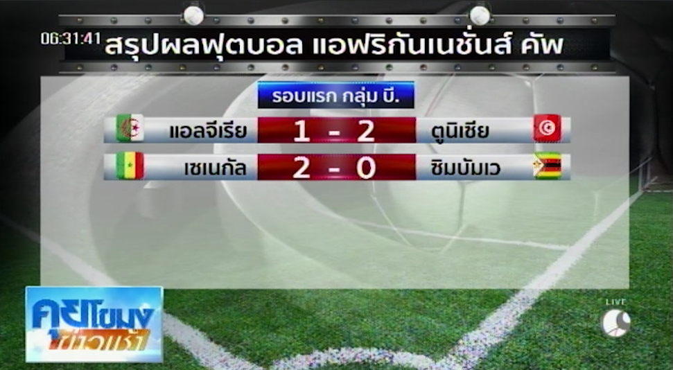 ฟุตบอลแอฟริกัน เนชั่นส์ คัพ รอบแรก กลุ่มบี แอลจีเรีย แพ้ ตูนิเซีย 1-2 โดยตูนิเซีย ได้ 2 ประตูจาก ยุสเซฟ เอ็มซัคนี นาที 50 นาอิม สลิติ จากจุดโทษ นาที 66 ส่วนแอลจีเรีย มาตีไข่แตกได้ในช่วงทดเวลาบาดเจ็บจาก โซเฟียเน ฮานนิ อีกคู่ เซเนกัล ชนะ ซิมบัมเว 2-0 โดยเซเนกัล ได้ประตูจาก ซาดิโอ มาเน นาทีที่ 9 อองรี ซาอิเวต์ นาที 13 ทำให้เซเนกัล ผ่านเข้ารอบ 8 ทีมสุดท้ายเป็นทีมแรก ชนะ 2 นัดมี 6 คะแนน