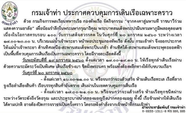 ด้วยกรมกิจการพลเรือนทหารเรือ กองทัพเรือ จัดกิจกรรม “จากคงคาสู่มหานที ราชนาวีร่วมแสดงความอาลัย” เพื่อน้อมรำลึกในพระมหากรุณาธิคุณ พระบาทสมเด็จพระปรมินทรมหาภูมิพลอดุลยเดช เนื่องในโอกาสครบรอบ 100 วันการเสด็จสวรรคต โดยนำเรือพระราชพิธีจำลองการเห่เรือน้อมแสดงอาลัย บริเวณแม่น้ำเจ้าพระยาหน้าหอประชุมกองทัพเรือ วันที่ 20 มกราคม 2560 ระหว่างเวลา 17.00-20.00 น. ดังนั้น กรมเจ้าท่าจึงออกประกาศให้แม่น้ำเจ้าพระยาด้านทิศเหนือ-สะพานสมเด็จพระปิ่นเกล้า ด้านทิศใต้-สะพานสมเด็จพระพุทธยอดฟ้าเป็นพื้นที่ควบคุมการเดินเรือเป็นการเฉพาะคราว