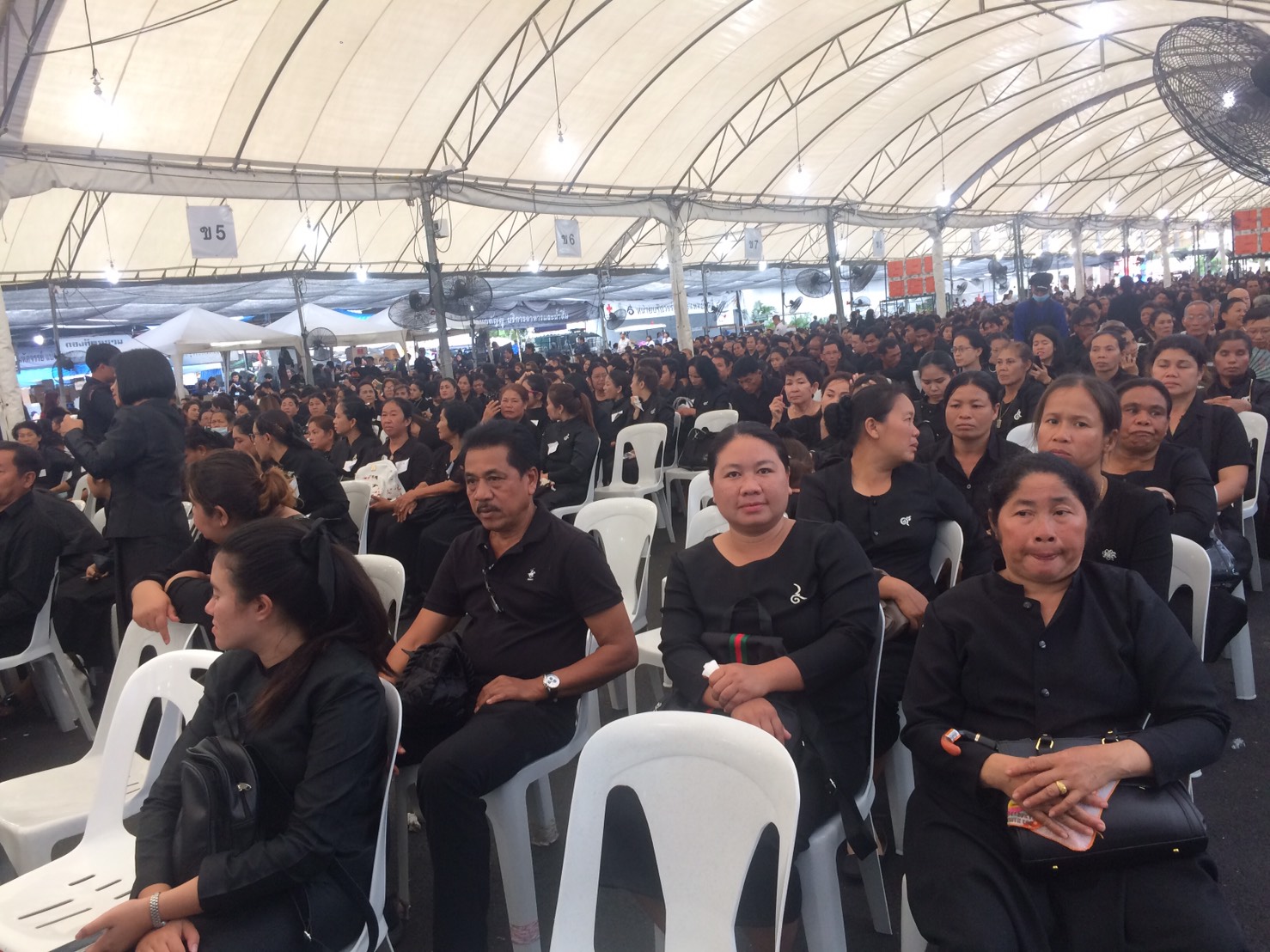 บรรยากาศที่พระบรมมหาราชวังวันนี้ ประชาชนในพื้นที่กรุงเทพฯและต่างจังหวัดเดินทางมากราบถวายบังคมพระบรมศพพระบาทสมเด็จพระปรมินทรมหาภูมิพลอดุลยเดช ณ พระที่นั่งดุสิตมหาปราสาท อย่างต่อเนื่อง ส่วนใหญ่มารอคิวตั้งแต่ช่วงเช้ามืด ท่ามกลางการดูแลความปลอดภัยและการอำนวยความสะดวกของเจ้าหน้าที่ โชคดีอากาศไม่ร้อนอบอ้าว เนื่องจากฝนตกลงมาในช่วงเช้า ขณะที่กลุ่มจิตอาสา นำน้ำดื่มและขนมมาบริการประชาชนที่มารอกราบถวายบังคมพระบรมศพฯ