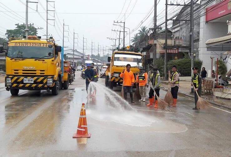 เช่นเดียวกับถนนสายเพชรเกษม-ชายทะเล หน้าโรงพยาบาลบางสะพาน เจ้าหน้าที่นำรถน้ำกว่า 50 คัน ทำความสะอาดถนนไปถึงตลาดบางสะพาน เขตเทศบาลตำบลกำเนิดนพคุณ รวมทั้งชุมชนหอนาฬิกา ชุมชนระหาร ชุมชนสวนฉัตร ชุมชนบ้านแสงทอง และชุมชนบ้านล่าง เพื่อบรรเทาความเดือดร้อนของชุมชนกว่า 2,000 ครัวเรือน จากนั้นจะทำความสะอาดวัดและโรงเรียน และหากประชาชนพื้นที่ใดต้องการความช่วยเหลือเร่งด่วน สามารถติดต่อนายช่างสุพจน์ เสริมทรัพย์ หัวหน้าหมวดทางหลวงประจวบคีรีขันธ์ หมายเลขโทรศัพท์ 086 – 930 – 1464