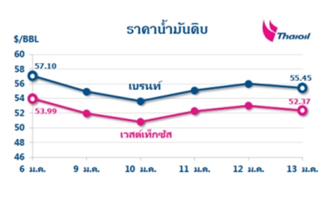 บมจ.ไทยออยล์ ยังสรุปสถานการณ์ราคาน้ำมันสัปดาห์ที่ผ่านมา (9 – 13 ม.ค.) ราคาน้ำมันดิบเวสต์เท็กซัสปรับลดลง 1.62 ดอลลาร์สหรัฐต่อบาร์เรล ปิดที่ 52.37 ดอลลาร์สหรัฐต่อบาร์เรล ขณะที่ราคาน้ำมันดิบเบรนท์ปรับลดลง 1.65 ดอลลาร์สหรัฐ ปิดที่ 55.45 ดอลลาร์สหรัฐ ส่วนราคาน้ำมันดิบดูไบปิดเฉลี่ยอยู่ที่ 53.90 ดอลลาร์สหรัฐ. – สำนักข่าวไทย