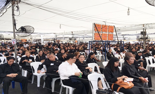 บรรยากาศโดยรอบพระบรมมหาราชวัง ประชาชนจากทั่วสารทิศทยอยเดินทางเข้ามากราบถวายบังคมพระบรมศพ พระบาทสมเด็จพระปรมินทรมหาภูมิพลอดุลยเดช ณ พระที่นั่งดุสิตมหาปราสาท อย่างต่อเนื่อง ทำให้บริเวณภายในท้องสนามหลวงเต็มไปด้วยประชาชน นั่งรอภายในเต็นท์โซนทิศเหนือเต็มพื้นที่ทั้ง 8เต็นท์ จนท้ายเเถววนอยู่ในสนามหลวง 2 รอบ โดยมีเจ้าหน้าที่ประจำเต็นท์ ค่อยประกาศลำดับแถว บอกคิวอย่างชัดเจน เพื่อสร้างความเข้าใจให้กับประชาชนที่นั่งพักคอย