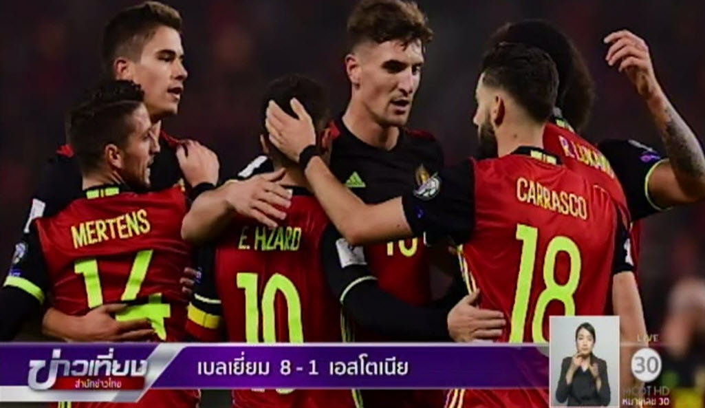 ฟุตบอลโลก 2018 รอบคัดเลือก โซนยุโรป รอบแบ่งกลุ่ม คู่ที่น่าสนใจ กลุ่ม เอช “ปีศาจแดงแห่งยุโรป” เบลเยียม เปิดบ้านถล่ม เอสโตเนีย 8-1 โดยได้ประตูจากโทมัส เมอร์นิเยร์ นาทีที่ 8, ดรีส์ เมอร์เทนส์ ทำแฮตทริก นาทีที่ 16, 64, 68 เอเด็น อาซาร์ นาทีที่ 25, ยานนิค คาร์ราสโก้ นาทีที่ 62 และ โรเมลู ลูกากู ยิง 2 ประตูนาทีที่ 83 และ 88 ส่วน เอสโตเนีย ได้คืนจาก เฮนรี่ อาเนียร์ นาทีที่ 29, เบลเยียมชนะ 4 นัดรวดมี 12 คะแนนเต็ม ยิงได้ 21 ประตูเสียเพียงประตูเดียว