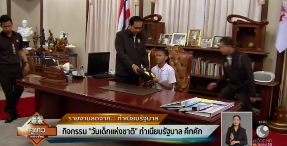 วันนี้ พล.อ.ประยุทธ์ จันทร์โอชา นายกรัฐมนตรี ได้เดินทางมาเปิดงานวันเด็กแห่งชาติ ประจำปี 2560 ที่ทำเนียบรัฐบาล พร้อมชมการแสดงชุดโขนเด็ก การแสดงชุดศิลปะมวยไทยของเด็กและเยาวชน ที่บริเวณสนามหญ้า หน้าตึกไทยคู่ฟ้า พร้อมเปิดโอกาสให้เยาวชนที่มีความประพฤติดี เรียนดี เด็กพิการ และเด็กด้อยโอกาสทางสังคม รวมทั้งเด็กๆ จากจังหวัดชายแดนภาคใต้ ได้เข้าเยี่ยมคารวะ และนายกรัฐมนตรีก็ได้พาเยี่ยมชมห้องทำงาน รวมทั้งห้องต่างๆ ภายในตึกไทยคู่ฟ้า รวมถึงได้นั่งเก้าอี้นายกรัฐมนตรี ซึ่งถือเป็นไฮไลท์ของงานด้วย ซึ่งเด็กๆ ที่ได้นั่งต่างแสดงความดีใจด้วยถ้วนหน้า นอกจากนี้ ยังมีการจัดแสดงหุ่นจำลองไดโนเสาร์ด้วย. -สำนักข่าวไทย