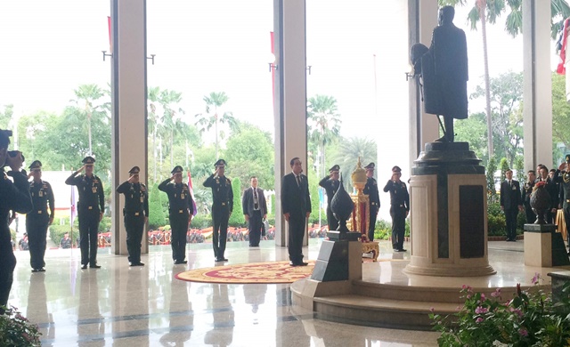 นายกรัฐมนตรีแท่นรับความเคารพจากกองทหารเกียรติยศ และวางพวงมาลาพระบรมราชานุสาวรีย์พระบาทสมเด็จพระมงกุฎเกล้าเจ้าอยู่หัว รัชกาลที่ 6 ก่อนจะร่วมพิธีสงฆ์และถ่ายรูปหมู่ร่วมกัน อย่างไรก็ตาม ภายหลังถ่ายภาพหมู่ นายกรัฐมนตรีได้พูดคุยเป็นการภายในร่วมกับองคมนตรี รัฐมนตรีและผู้บัญชาการทหารบกภายในห้องรับรองเป็นเวลาร่วม 20 นาที