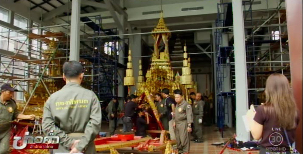 กทม. 12 ม.ค. – ราชรถราชยาน และพระยานมาศสำหรับใช้ในงานพระราชพิธีถวายพระเพลิงพระบรมศพ พระบาทสมเด็จพระปรมินทรมหาภูมิพลอดุลยเดช เริ่มบูรณปฏิสังขรณ์แล้ว แต่ละหน่วยงานรับผิดชอบจะร่วมบูรณะอย่างสมพระเกียรติ