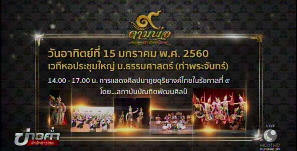 นอกจากนี้ อสมท สถาบันบัณฑิตพัฒนศิลป์ กระทรวงวัฒนธรรม องค์กรพันธมิตร น้อมสำนึกในพระมหากรุณาธิคุณพระบาทสมเด็จพระปรมินทรมหาภูมิพลอดุลยเดช จัดการแสดงชุดใหญ่ ศิลปนาฏดุริยางค์ไทยในรัชกาลที่ ๙ ในงาน “๙ ตามพ่อสานต่อพระราชปณิธาน” วันอาทิตย์ที่ 15 มกราคม 2560 ที่หอประชุมใหญ่ มหาวิทยาลัยธรรมศาสตร์ ท่าพระจันทร์ ตั้งแต่ 14.00 น.