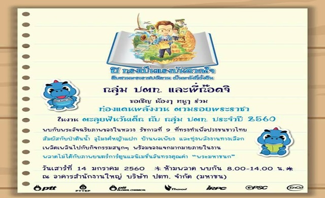 ฝ่ายประชาสัมพันธ์ บมจ. ปตท. แจ้งว่า ปตท.และบริษัทในเครือจัดงานวันเด็ก ประจำปี 2560 ในวันเสาร์ที่ 14 มกราคม 2560 ตั้งแต่เวลา 09.00 – 14.00 น. ณ ลานกิจกรรมด้านหน้าอาคารสำนักงานใหญ่ ปตท. ภายใต้แนวคิด “ธ ทรงเป็นแรงบันดาลใจ สืบสานพระราชปณิธาน เป็นพลังที่ยั่งยืน” เพื่อนำเสนอให้เห็นถึงพระราชกรณียกิจ ที่เกี่ยวข้องกับการดำเนินงานของกลุ่ม ปตท. เพื่อรำลึกในพระมหากรุณาธิคุณ และสืบสานพระราชปณิธานต่อไป พร้อมทั้งสอดแทรกความรู้ความเข้าใจเรื่องพลังงานให้กับเยาวชน และผู้ปกครองที่มาร่วมงาน