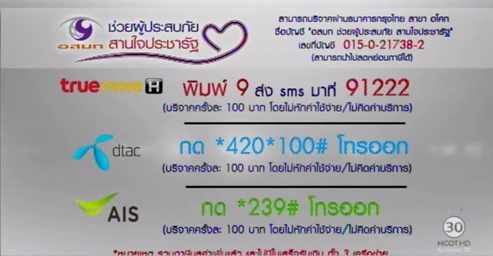 *** โอนผ่านธนาคารสามารถนำไปลดหย่อนภาษีได้ หากบริจาคผ่าน 3 ค่ายมือถือ บริจาคครั้งละ 100 บาท โดยไม่หักค่าใช้จ่าย และไม่คิดค่าบริการ ตั้งแต่วันนี้ถึงวันที่ 31 มกราคม 2560 . – สำนักข่าวไทย