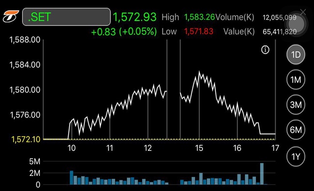ตลท. 11 ม.ค. – ผู้สื่อข่าวรายงานว่าดัชนีตลาดหลักทรัพย์ฯ ปิดตลาดวันนี้ (11 ม.ค.) ที่ระดับ 1,572.93 จุด เพิ่มขึ้น 0.83 จุด (+0.05%) มูลค่าการซื้อขาย 65,411.82 ล้านบาท โดยดัชนีเคลื่อนไหวค่อนข้างผันผวน แต่ส่วนใหญ่อยู่ในแดนบวก ขยับขึ้นแตะจุดสูงสุดของวันที่ระดับ 1,583.26 จุด และต่ำสุดของวันอยู่ที่ 1,571.83 จุด