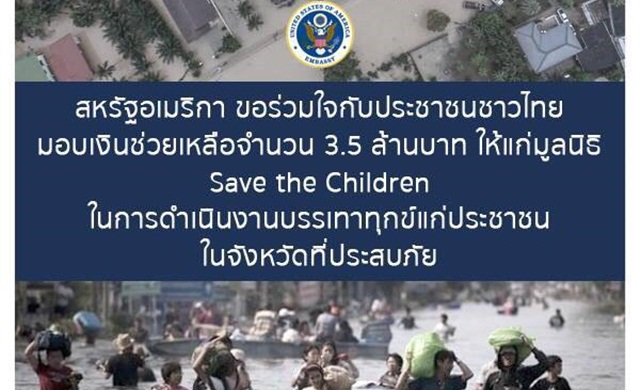 ความเสียหายจากฝนตกหนักและน้ำท่วมได้ก่อให้เกิดความเดือดร้อนแก่ประชาชนเป็นวงกว้าง สหรัฐอเมริกาจึงขอร่วมใจกับประชาชนชาวไทย โดยจะมอบเงินช่วยเหลือ จำนวน 100,000 ดอลลาร์สหรัฐ (ประมาณ 3.5 ล้านบาท) ผ่านองค์กรเพื่อการพัฒนาระหว่างประเทศแห่งสหรัฐอเมริกา (USAID) ให้แก่มูลนิธิ Save the Children ในการดำเนินงานบรรเทาทุกข์แก่ประชาชนในจังหวัดที่ประสบภัย.-สำนักข่าวไทย