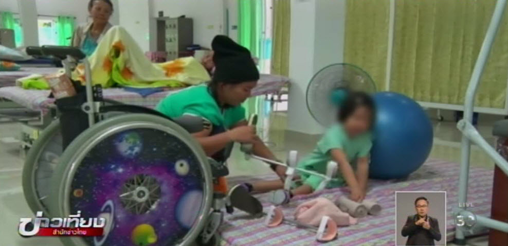 นี่เป็นภาพของ “น้องเอมื่อ” เด็กหญิงวัย 5 ขวบ ที่บาดเจ็บสาหัสจากการถูกพ่อเมายาบ้าใช้ปืนแก๊ปไทยประดิษฐ์ยิงใส่ กระสุนเจาะเข้าที่ช่องท้อง ศีรษะด้านหลัง และกระดูกสันหลัง ทำให้ช่วงล่างทั้งหมดไม่มีความรู้สึก เวลาขับถ่ายต้องใช้วิธีสวน และต้องพกถุงปัสสาวะที่เจาะจากกระเพาะปัสสาวะไว้ตลอด
