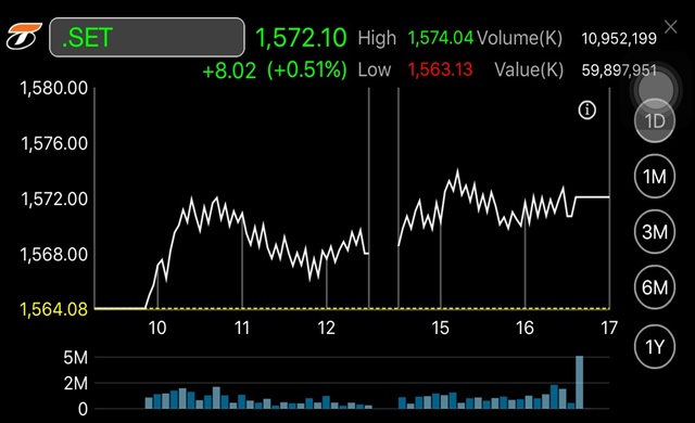 ตลท. 10 ม.ค. – ผู้สื่อข่าวรายงานว่าดัชนีตลาดหลักทรัพย์ฯ ปิดตลาดวันนี้ (10 ม.ค.) ที่ระดับ 1,572.10 จุด เพิ่มขึ้น 8.02 จุด หรือร้อยละ 0.51 มูลค่าการซื้อขาย 59,889.20 ล้านบาท โดยดัชนีเคลื่อนไหวแดนบวกเป็นส่วนใหญ่ แตะจุดสูงสุดที่ 1,574.04 จุด และแตะจุดต่ำสุดระดับ 1,563.13 จุด