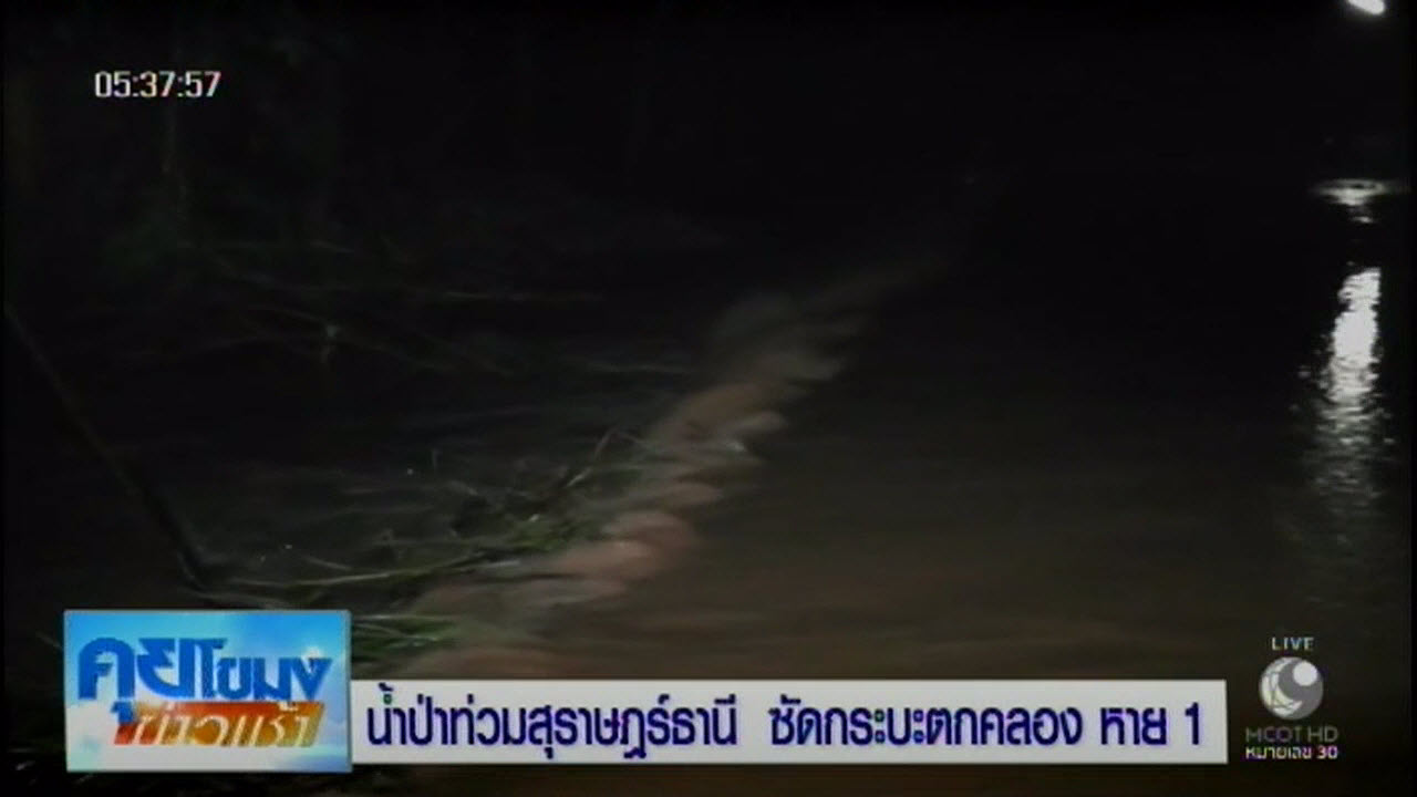 สุราษฎร์ธานี 9 ม.ค.-น้ำป่าหลากท่วมสุราษฎร์ธานี พัดรถกระบะตกคลอง ช่วยได้ 1 คน ยังสูญหายอีก 1 คน