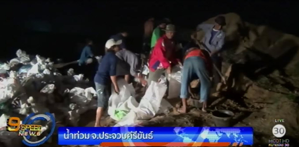 สถานการณ์น้ำท่วมที่ จ.ประจวบคีรีขันธ์ หลังฝนตกต่อเนื่องหลายวันทำให้มวลน้ำจากเทือกเขาตะนาวศรี ไหลเข้า 4 อ่างเก็บน้ำ อย่างรวดเร็วและมีปริมาณมาก จนล้นหลากเข้าท่วมบ้านเรือนประชาชน และถนนในเขตตัวเมืองบางสะพาน โดยถนนสายเพชรเกษม-บางสะพาน บางจุดมีน้ำท่วมสูงกว่า 50 เซนติเมตร ขณะที่ปภ.จังหวัด ร้องขอกำลังจากหน่วยงานต่างๆ เข้าช่วยเหลือประชาชนและกรอกกระสอบทราย เพื่อสร้างกำแพงป้องกันน้ำเข้าท่วมโรงพยาบาลบางสะพาน และเร่งเคลื่อนย้ายเครื่องเอ็กซเรย์ออกจากห้องปฏิบัติการไว้ในตึกที่อยู่ในพื้นที่สูง ป้องกันความเสียหาย.-สำนักข่าวไทย