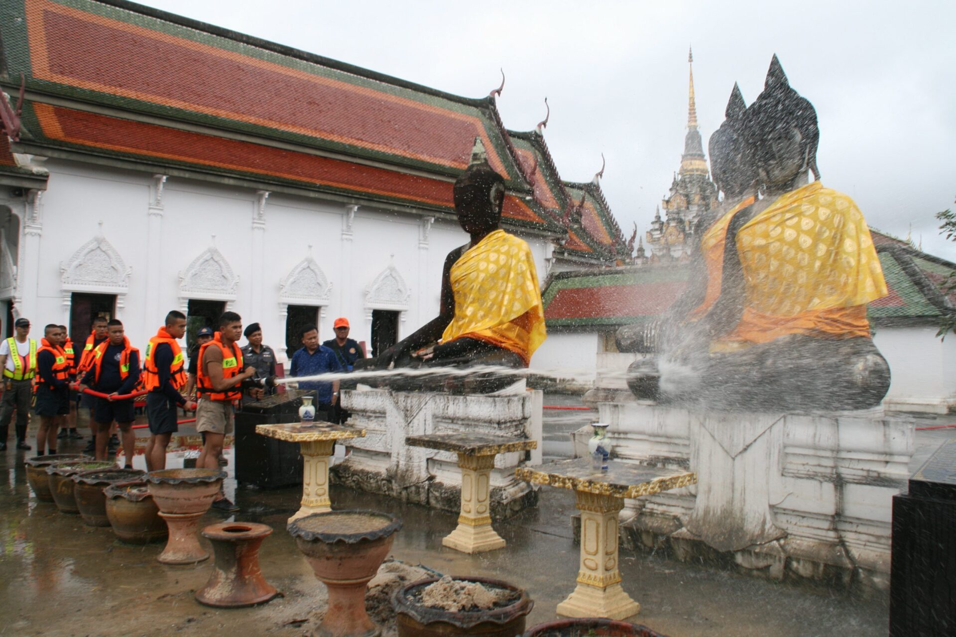 วันนี้ (8 ม.ค.) ทหารกองบิน 7 สุราษฎร์ธานี ระดมกำลังร่วมกับหน่วยงานแต่ละท้องที่ช่วยกันทำความสะอาดพื้นที่น้ำท่วมในอำเภอท่าชนะและไชยา หลังจากระดับน้ำลดลงเป็นปกติ โดยบริเวณวัดพระบรมธาตุไชยาวรวิหาร ต.เวียง อ.ไชยา เจ้าหน้าที่ฉีดล้างทั้งภายในและรอบบริเวณ ซึ่งปีนี้วัดถูกน้ำท่วมถึง 70 เซนติเมตร สูงกว่าปี 2554 น้ำท่วม 30 ซม. ส่งผลให้พระพุทธรูปสกุลช่างไชยา ขนาดและปางต่าง ๆ รวม 180 องค์ ซึ่งเป็นพระพุทธรูปหินทรายแดงสมัยอยุธยาเสียหายบางส่วน รวมทั้งสิ่งของภายในวัดที่ไม่สามารถขนย้ายขึ้นที่สูงได้ทัน แม้ก่อนหน้านี้ได้ทำกำแพงกั้นน้ำแล้ว แต่ฝนตกในพื้นที่มีปริมาณมาก น้ำระบายไม่ทัน จึงท่วมขังสูงทั้งภายในและภายนอก.-สำนักข่าวไทย