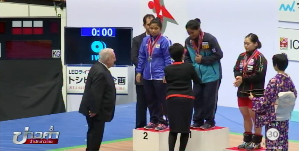 ท่าคลีน แอนด์ เจิร์ก น้องบีม ยังคงยอดเยี่ยมหลังยกได้ 115 กิโลกรัม คว้าเหรียญทองไปครองเป็นเหรียญที่ 2 ของตัวเอง ส่วนเหรียญเงินดาวี โรชิลาตา จากอินเดีย 94 กิโลกรัม และเหรียญทองแดง ริกา วากากูระ จากญี่ปุ่น 93 กิโลกรัม และน้องบีม ยังมาคว้าเหรียญทองที่ 3 ได้จากน้ำหนักรวม 205 กิโลกรัม เหรียญเงิน อินเดีย 169 กิโลกรัมและญี่ปุ่น 167 กิโลกรัม. -สำนักข่าวไทย