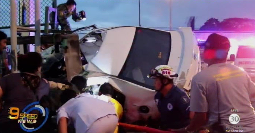 ปทุมธานี 8 ม.ค. – ที่อำเภอธัญบุรี จังหวัดปทุมธานี ตำรวจภูธรประตูน้ำจุฬาลงกรณ์ และเจ้าหน้าที่กู้ภัยตรวจสอบเหตุรถเก๋งขับชนรั้วร้านจำหน่ายวัสดุก่อสร้าง ริมถนนรังสิต-นครนายก ฝั่งขาออก สภาพรถเก๋งพังยับเยิน ซึ่งเจ้าหน้าที่ใช้เครื่องตัดถ่างนำร่างนายพิทวัส แผนสมบูรณ์ ผู้บาดเจ็บส่งโรงพยาบาล ส่วนผู้เสียชีวิตในซากรถ 2 คน อายุประมาณ 25-30 ปี ไม่ทราบชื่อและที่อยู่ เนื่องจากไม่มีเอกสารติดตัว อุบัติเหตุครั้งนี้ยังทำให้รถจักรยานยนต์บริเวณที่เกิดเหตุถูกชนเสียหายอีก 3 คัน ขณะนี้อยู่ระหว่างสอบสวนสาเหตุของอุบัติเหตุที่เกิดขึ้น. -สำนักข่าวไทย