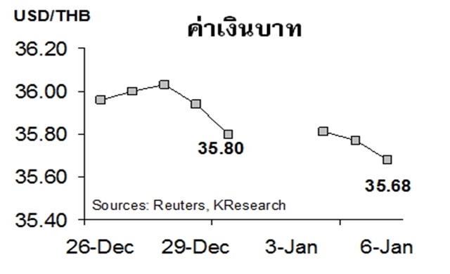 สำหรับสัปดาห์หน้า (9-13 ม.ค.) ธนาคารกสิกรไทยประเมินกรอบการเคลื่อนไหวของเงินบาทที่ 35.60-35.90 บาทต่อดอลลาร์สหรัฐ จุดสนใจของตลาดน่าจะอยู่ที่ถ้อยแถลงของเจ้าหน้าที่เฟดและการแถลงข่าวของนายโดนัลด์ ทรัมป์ ว่าที่ประธานาธิบดีสหรัฐ ขณะที่ข้อมูลเศรษฐกิจที่สำคัญของสหรัฐ ได้แก่ ยอดค้าปลีก ดัชนีราคาผู้ผลิต เดือนธันวาคม สตอกสินค้าคงคลังภาคธุรกิจเดือนพฤศจิกายน ดัชนีความเชื่อมั่นผู้บริโภค (เบื้องต้น) เดือนมกราคม นอกจากนี้ ตลาดอาจรอติดตามสถานการณ์ค่าเงินหยวนและตัวเลขเศรษฐกิจเดือนธันวาคมของจีนด้วยเช่นกัน