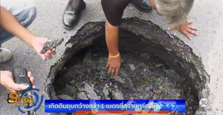 สุราษฎร์ธานี 13 พ.ย. – เกิดดินยุบเป็นหลุมขนาดใหญ่กว้างกว่า 1 เมตร ลึกกว่า 70 เซนติเมตร กลางถนนในเขตเทศบาลนครสุราษฎร์ธานี เจ้าหน้าที่ต้องปิดการจราจรชั่วคราวเพื่อป้องกันอุบัติเหตุ