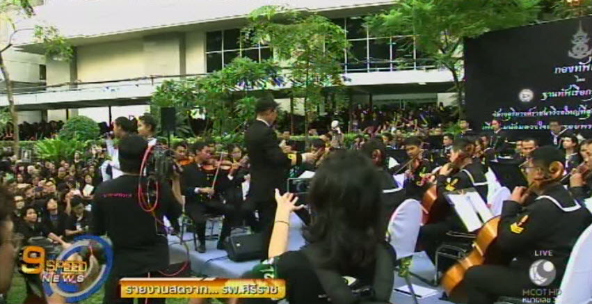 ซึ่งก่อนหน้านี้มีการบรรเลงเพลงพระราชนิพนธ์จากวงดุริยางค์ราชนาวี โดยบทเพลงที่นำมาบรรเลงในกิจกรรม น้อมดวงใจชาวศิริราช ตามรอยพระราชปณิธานพระภูมิพล เป็นบทเพลงพระราชนิพนธ์ และเพลงเทิดพระเกียรติรวมแล้ว 15 เพลง อาทิ เพลงแสงเทียน อาทิตย์อับแสง ชะตาชีวิต ลมหนาว ในหลวงของแผ่นดิน เป็นต้น ซึ่งแต่ละบทเพลงได้หลอมรวมพลังความสามัคคี บุคลากรโรงพยาบาลศิริราช กองทัพเรือ และประชาชนจากทั่วสารทิศ ด้วยเครื่องดนตรี 130 ชิ้น พร้อมด้วยนักร้อง นักดนตรีกว่า 200 คน นำประชาชนประสานเสียง ขับร้องบทเพลง ที่กลั่นออกมาจากใจ ด้วยความอาลัยรำลึกถึงพระบาทสมเด็จพระปรมินทรมหาภูมิพลอดุลยเดช จนไม่อาจกลั่นน้ำตาไว้ได้