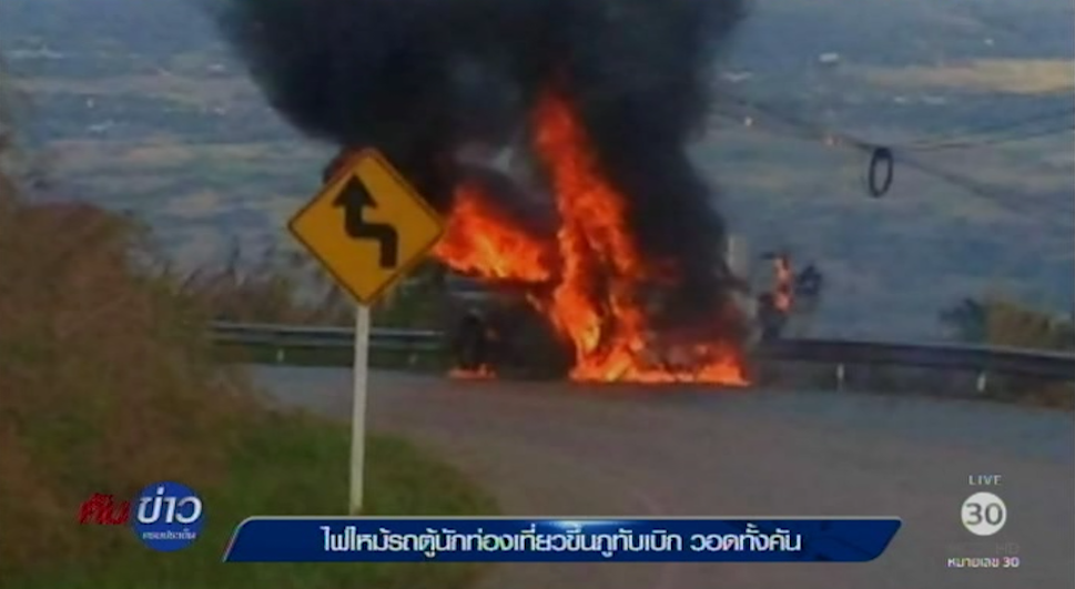 เพชรบูรณ์ 6 ม.ค.-รถตู้เกิดอุบัติเหตุไฟลุกท่วมวอดทั้งคันขณะขับขึ้นภูทับเบิก คณะพยาบาลและเจ้าหน้าที่โรงพยาบาลที่โดยสารมารวม 14 ชีวิตปลอดภัย หนีออกมาได้ทัน