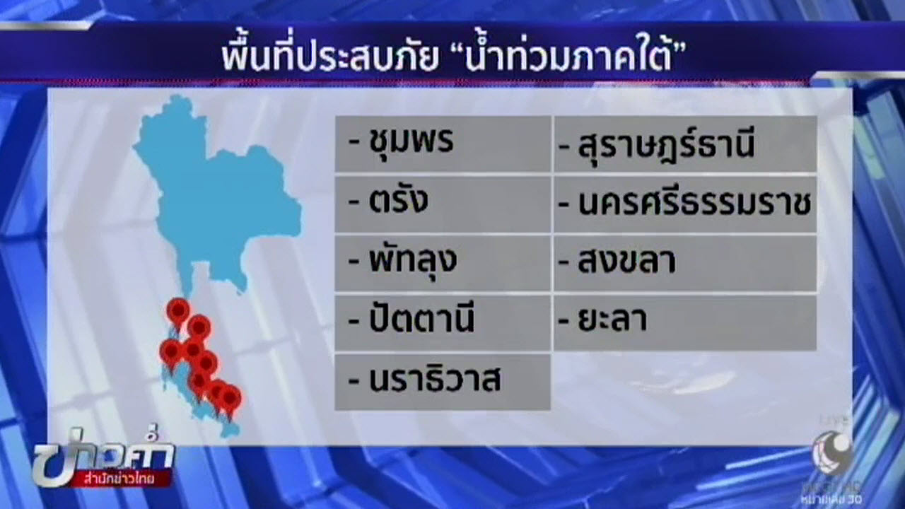 การสำรวจตั้งแต่วันที่ 1 มกราคม ถึงปัจจุบัน พบว่าจังหวัดที่ประสบภัยน้ำท่วมมีด้วยกัน 9 จังหวัด ได้แก่ พัทลุง นราธิวาส ยะลา สงขลา ปัตตานี ตรัง สุราษฎร์ธานี นครศรีธรรมราช และชุมพร