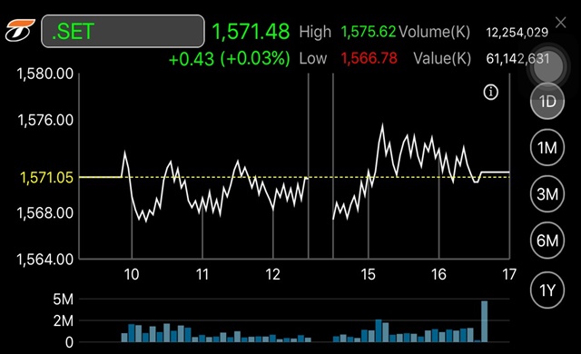 ตลท. 6 ม.ค. – ผู้สื่อข่าวรายงานว่าดัชนีตลาดหลักทรัพย์ฯ ปิดการซื้อขายวันนี้ (6 ม.ค.) ที่ระดับ 1,571.48 จุด เพิ่มขึ้น 0.43 จุด หรือร้อยละ 0.03 มูลค่าการซื้อขาย 61,142.63 ล้านบาท โดยดัชนีเคลื่อนไหวทั้งแดนบวกและลบในกรอบแคบ ๆ สูงสุดของวันที่ระดับ 1,575.62 จุด และต่ำสุดที่ระดับ 1,566.78 จุด