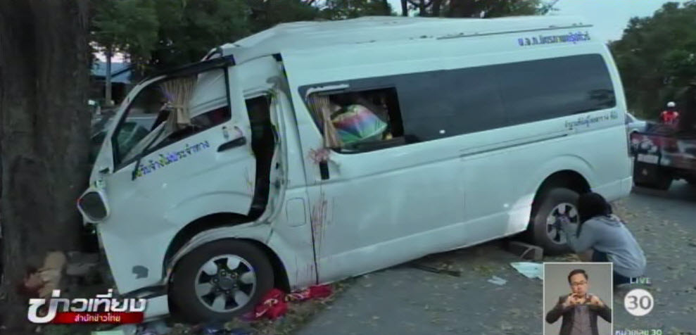 นี่เป็นสภาพรถตู้โดยสารไม่ประจำทาง ทะเบียน 30-0775 สมุทรสาคร ที่พุ่งชนต้นไม้ บริเวณ ถ.พหลโยธิน ขาขึ้น กิโลเมตรที่ 392-393 อ.ขาณุวรลักษบุรี จ.กำแพงเพชร เป็นเหตุให้ผู้โดยสารหญิงชาวเมียนมาร์เสียชีวิต 1 ราย และมีผู้โดยสารบาดเจ็บอีก 4 ราย สอบสวนทราบว่า รถคันดังกล่าวเดินทางมาจาก จ.สมุทรสาคร เพื่อไปยัง อ.แม่สอด จ.ตาก เมื่อมาถึงจุดเกิดเหตุ คาดว่าคนขับหลับใน จึงเสียหลักชนกับต้นไม้อย่างแรง โดยตำรวจรอนายชัชวาล จันทมาศ อายุ 48 ปี คนขับรถตู้คันดังกล่าว หายจากอาการบาดเจ็บ เพื่อสอบปากคำหาสาเหตุที่แน่ชัดต่อไป. – สำนักข่าวไทย